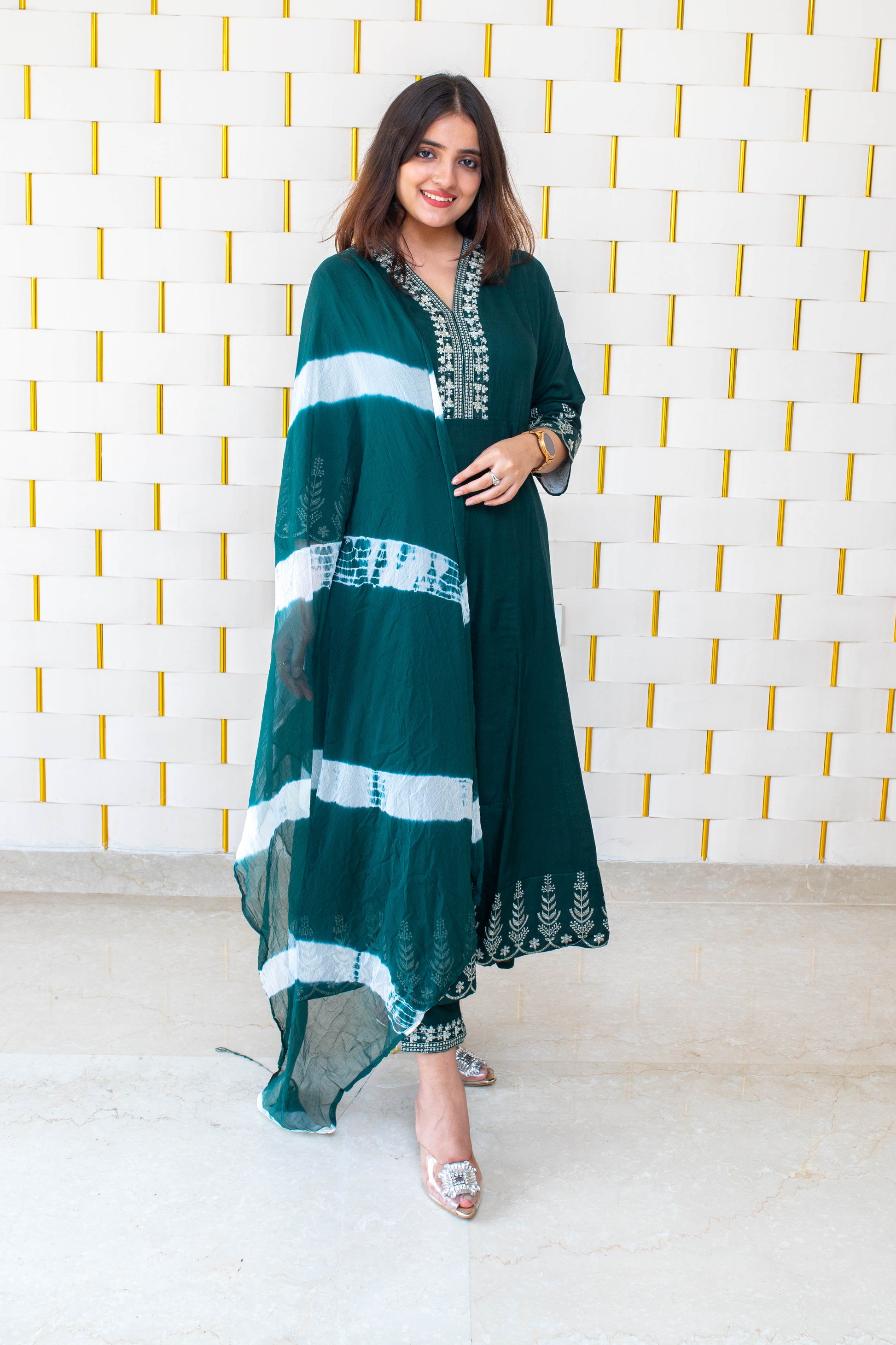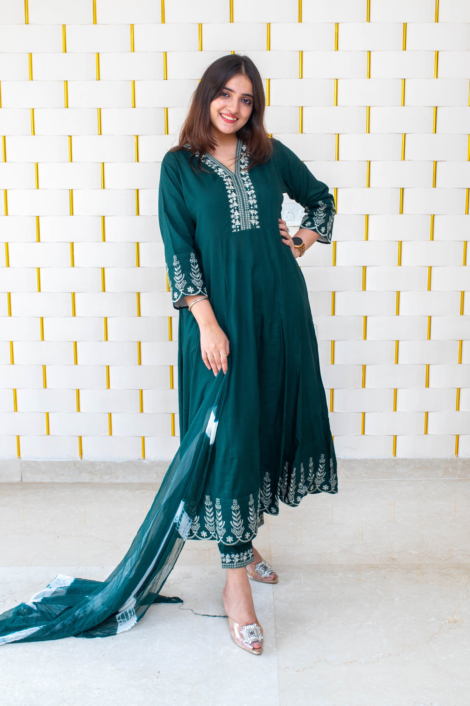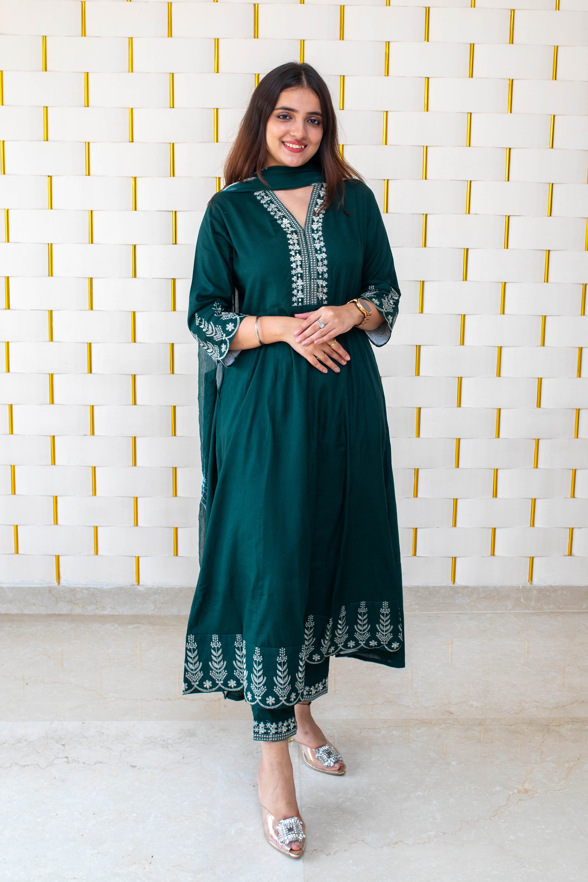 Elevate your style with our Peacock Green Suit, featuring exquisite white kadhai work on the neck, sleeves, and borders, adding a touch of elegance and sophistication. The rich peacock green fabric is beautifully complemented by a green and white dupatta, creating a harmonious and chic look. Ideal for festive occasions or special events, this ensemble combines traditional artistry with contemporary flair, ensuring you stand out with grace.